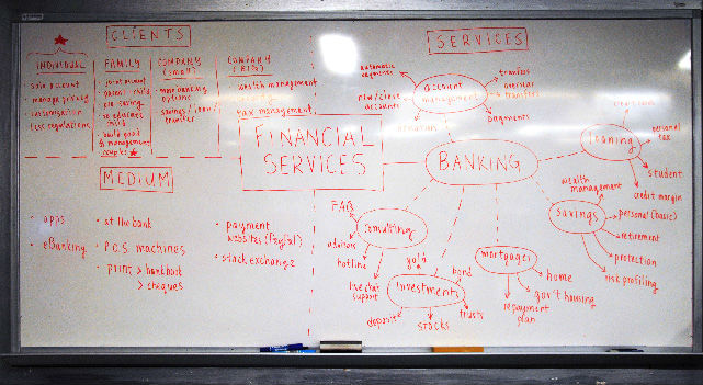 From the top of our heads, we briefly mapped out common banking services, clients, and the mediums in which these information are presented.