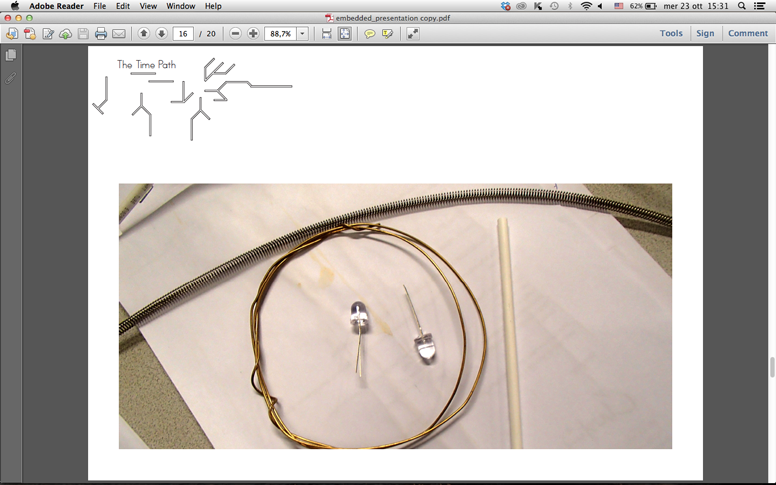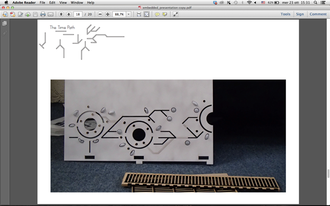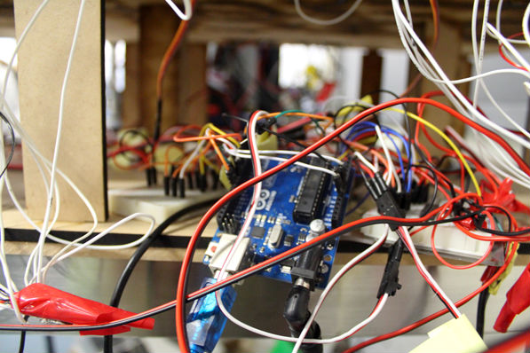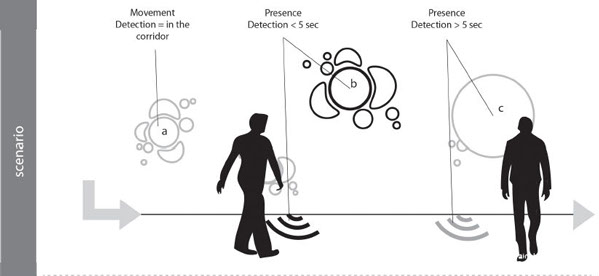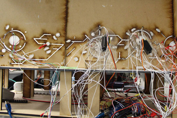 Four different motion sensors detect the person's position, activating lights and shaking of the different spheres. These are coordinated and regulated by the Arduino Boards which activate the 80 LEDs and the 6 motors working at `individual intensities, according to the person position within the path.