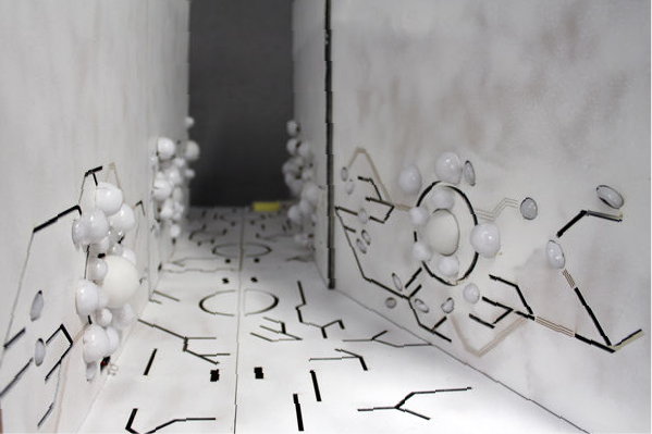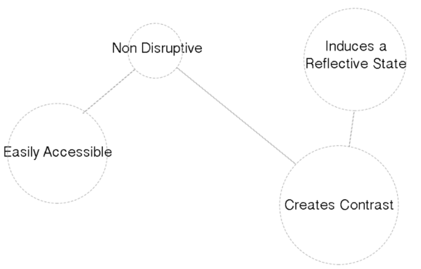 Mixing the organic and the technological, we have created a path of luminous spheres that pulsate and shake in relation to the users’ pace. When completely still, the users are treated to a vision of the outside street in an accelerated motion, illustrating the contrast inside this quiet, cave-like space.
