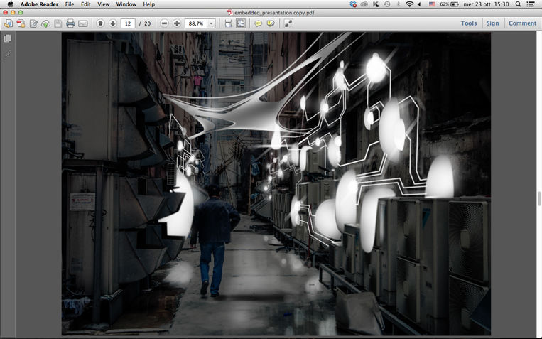 Back alleys can become surprising spots. Situated around the corner from frenetic life, they offered a good location for our design. A perfect place where people can have the possibility to escape from the chaotic city life, and see the environment from a different point of view. Put in contrast fast daily life with a calm "pause".